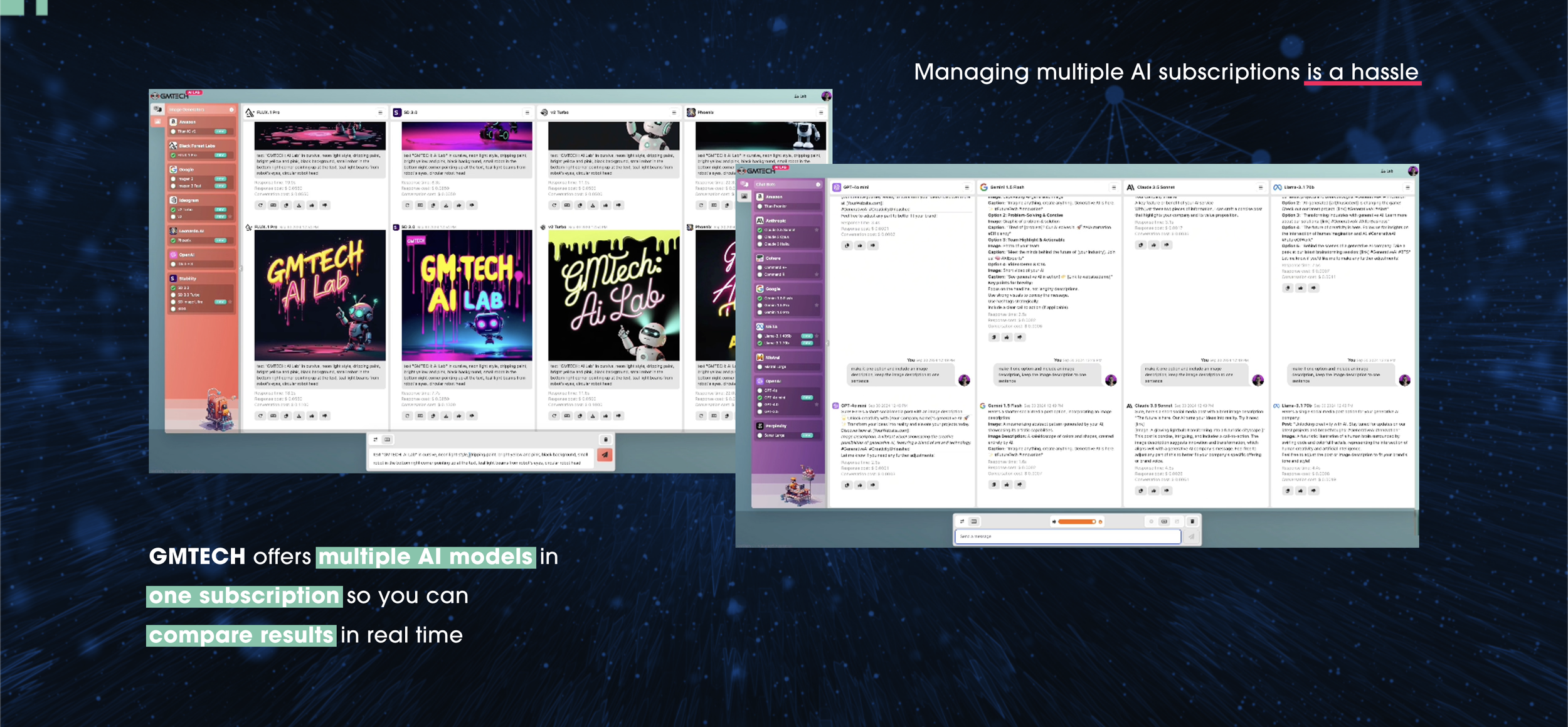 GMTECH offers users access to all of the top premium language models and image generators for one subscription fee. The AI Lab has a unique interface that enables users to compare results in real time. The journey is just beginning in this exciting new field of AI evaluation.